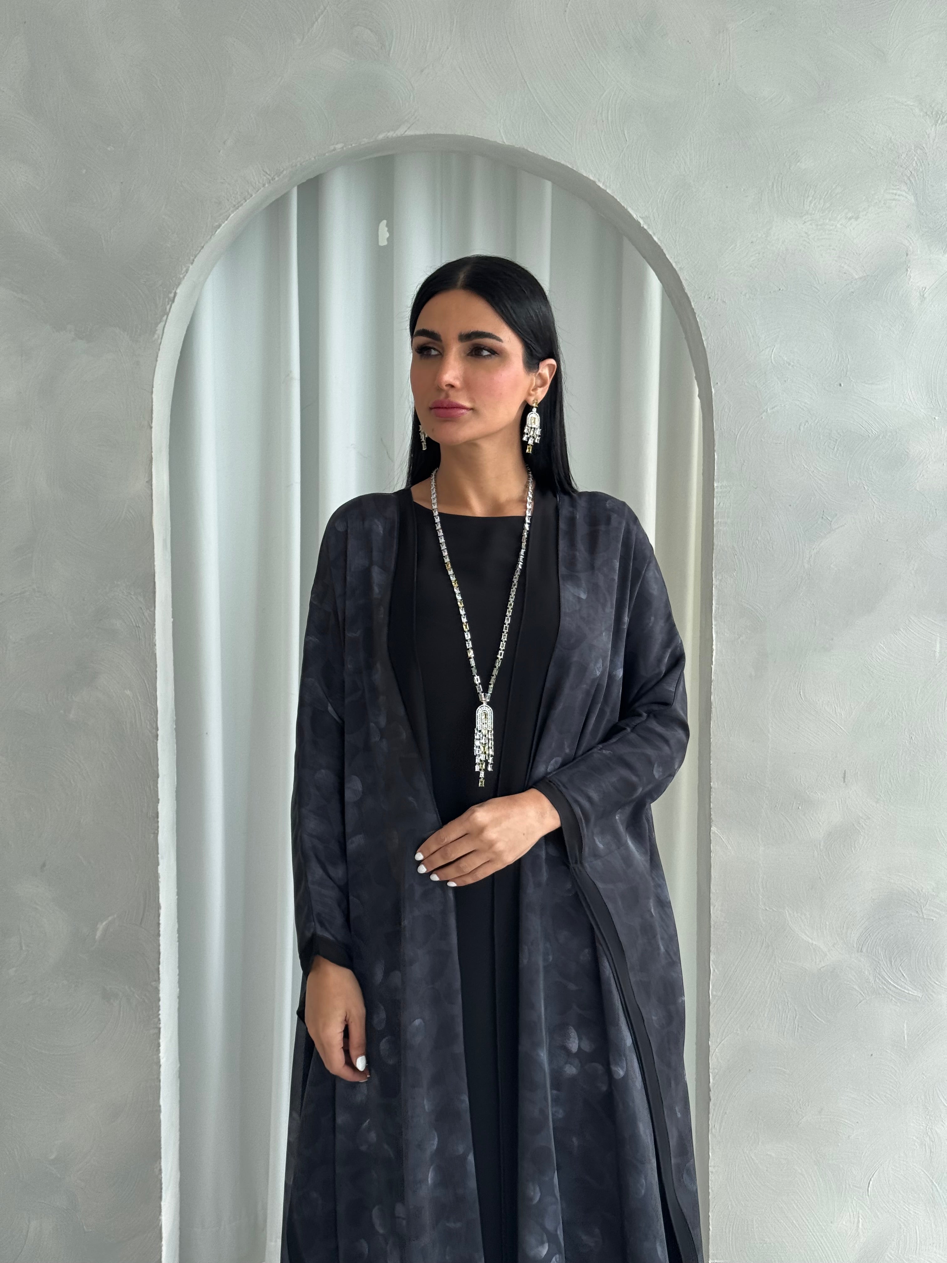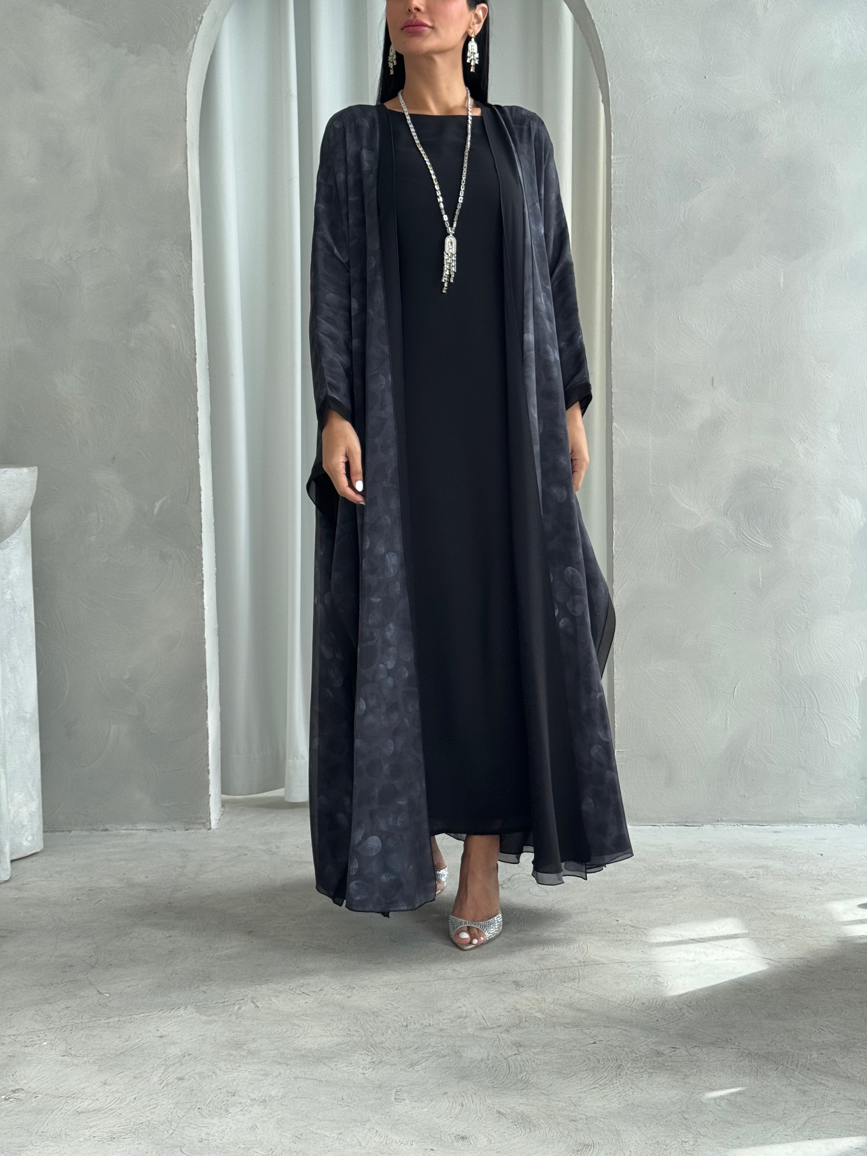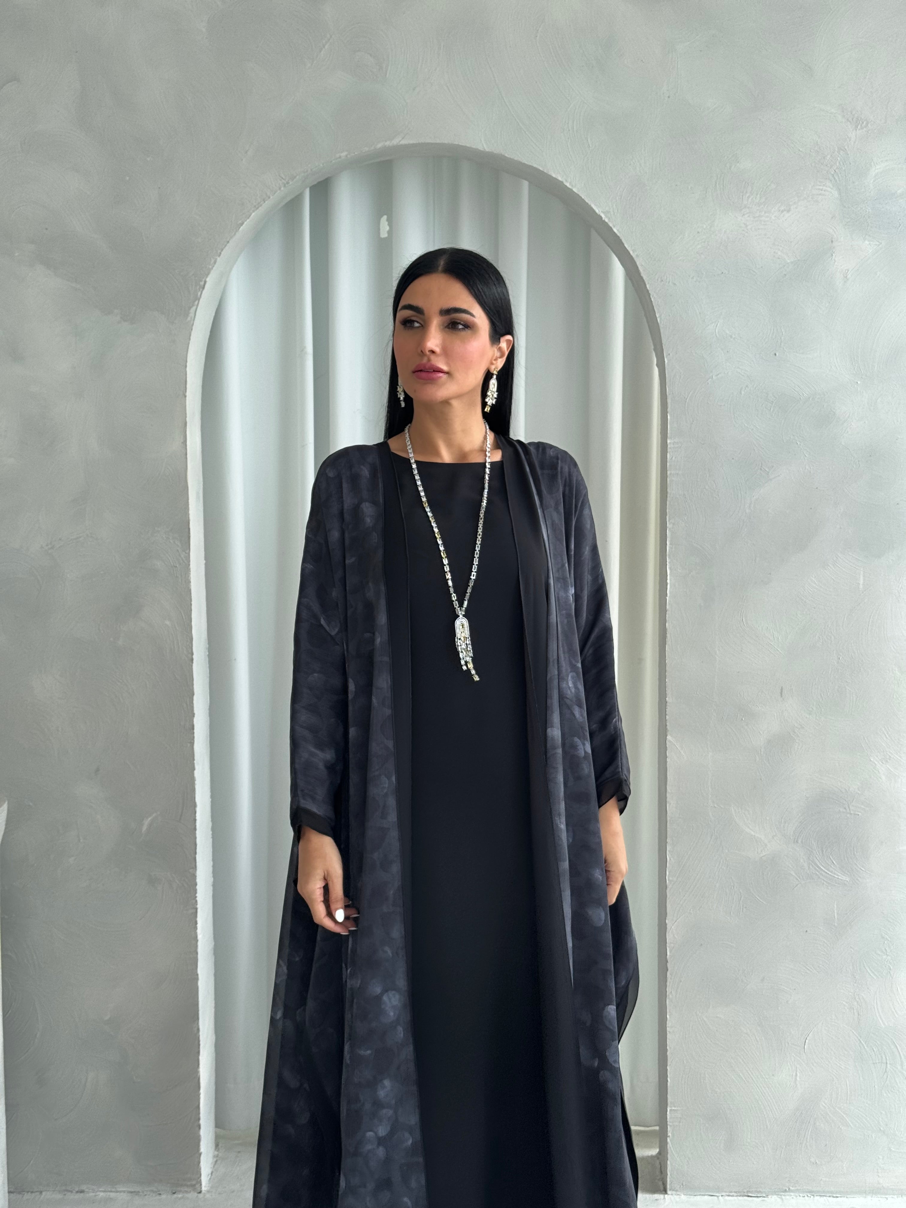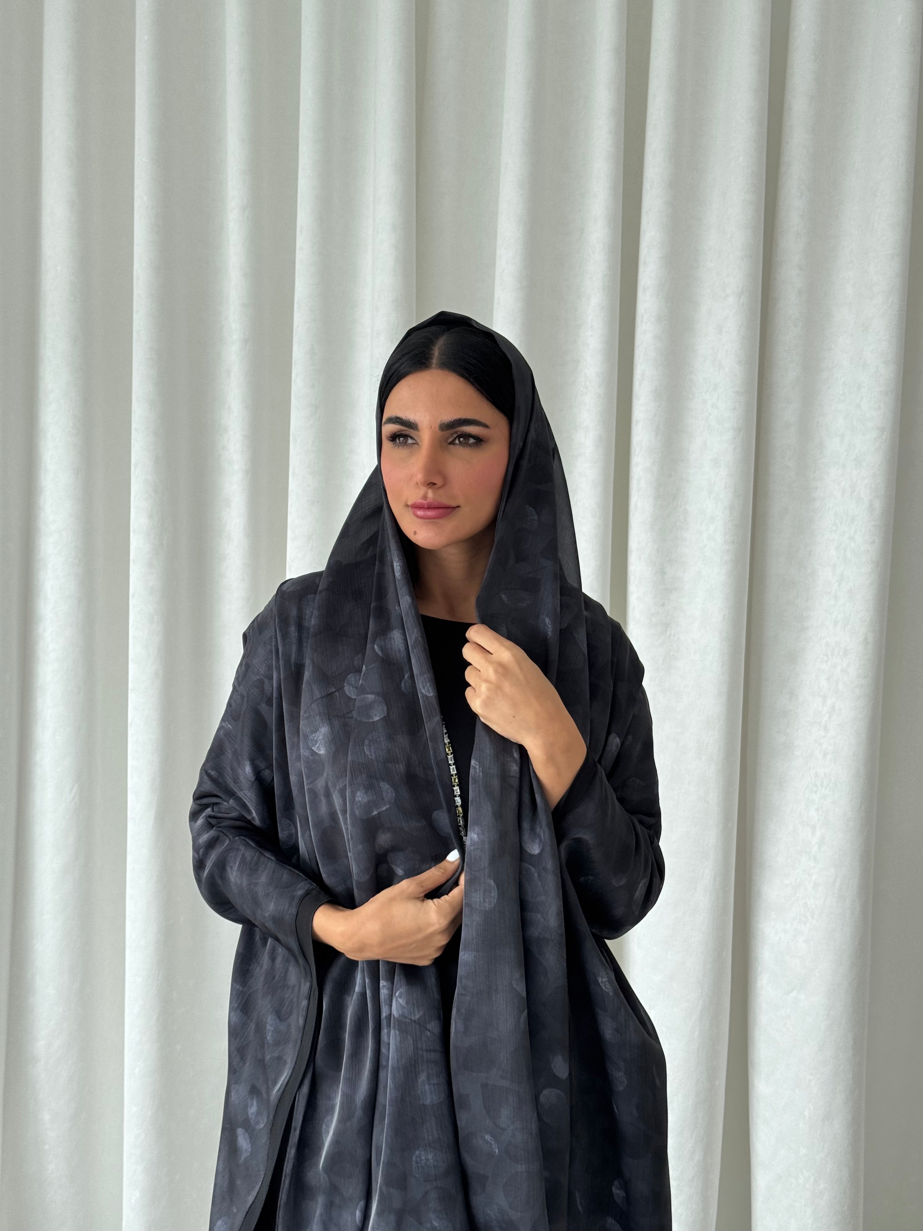 This abaya set includes an abaya, dress, and shaila. Fabric of abaya is organza and chiffon.