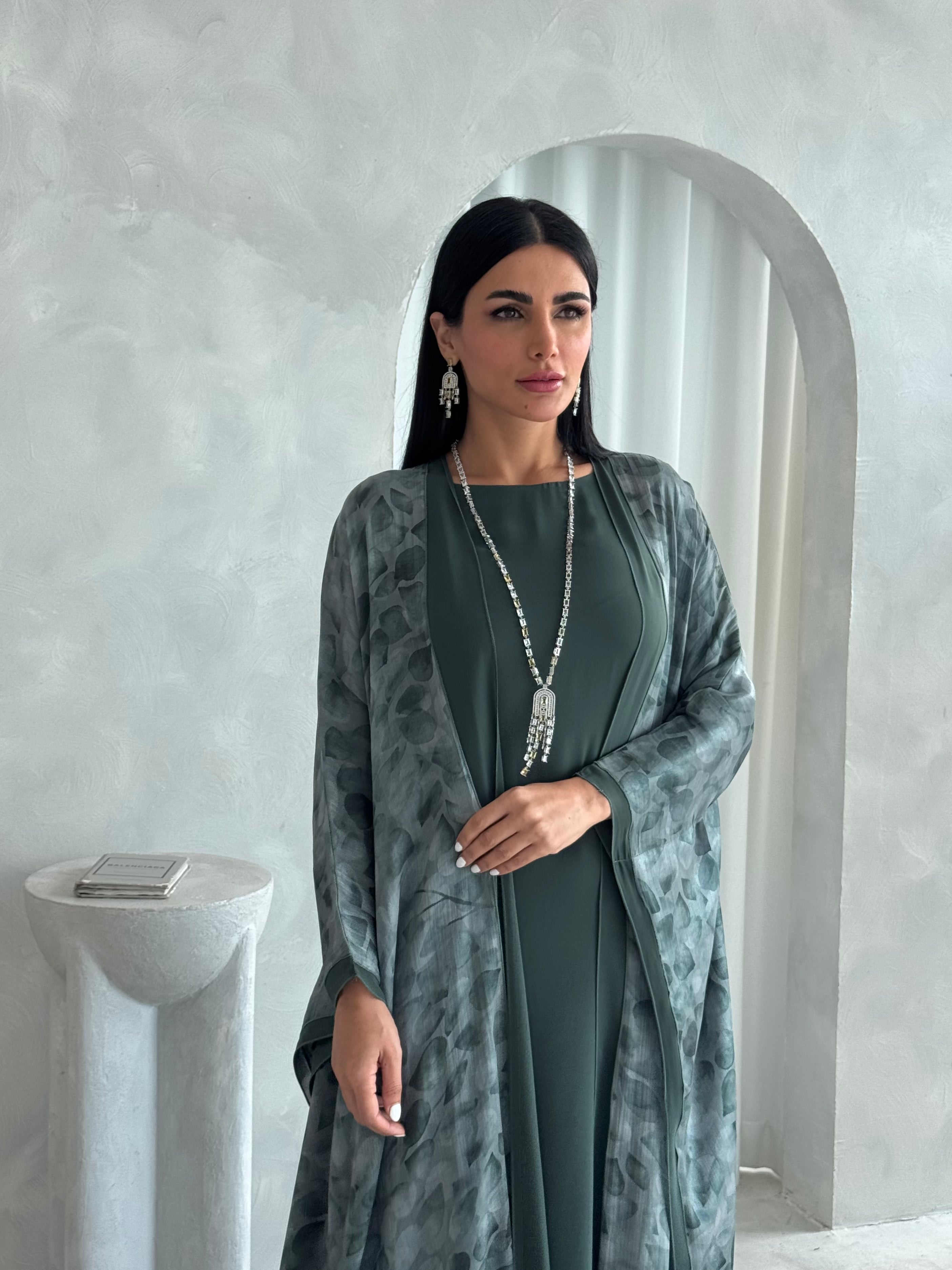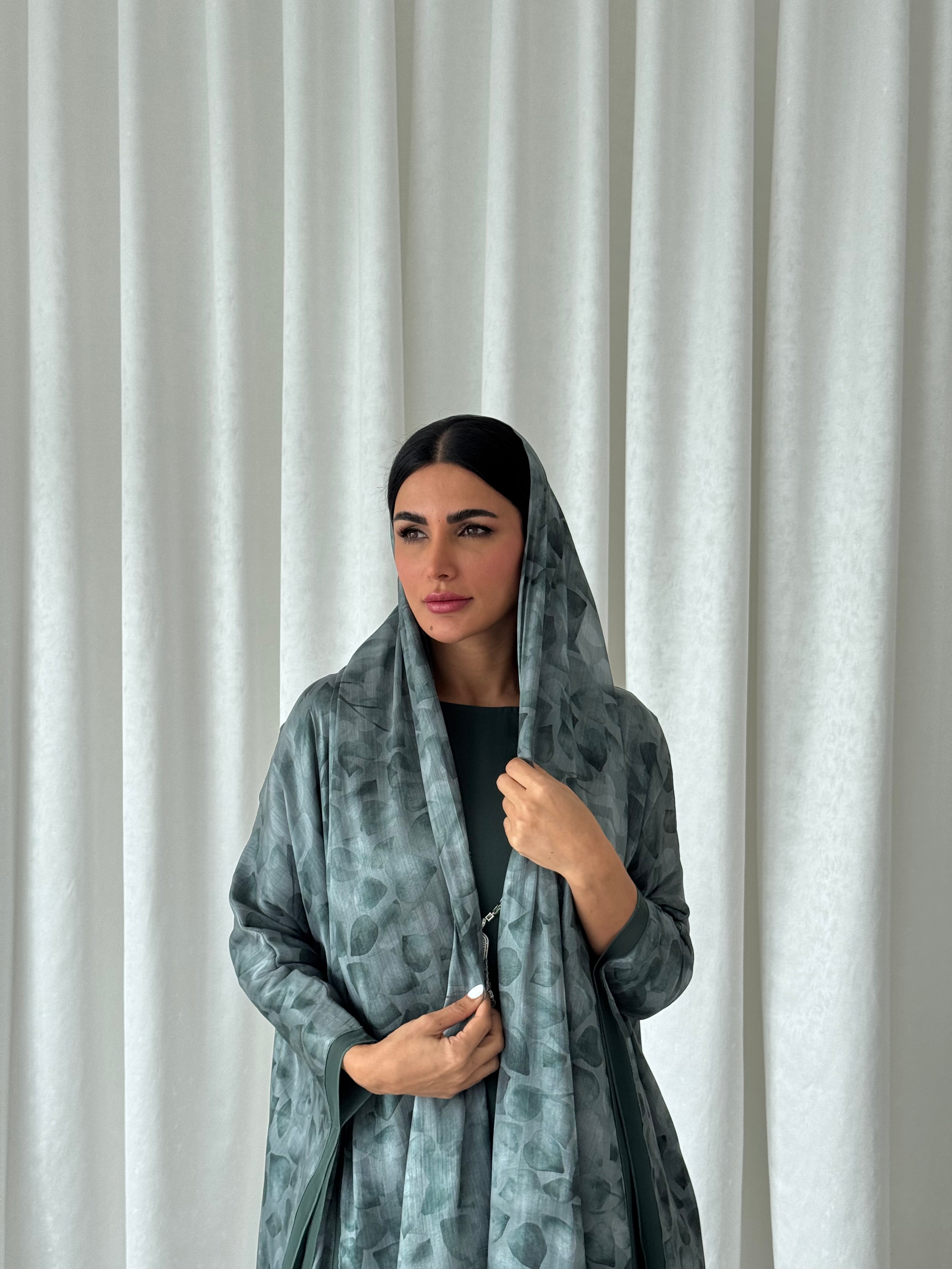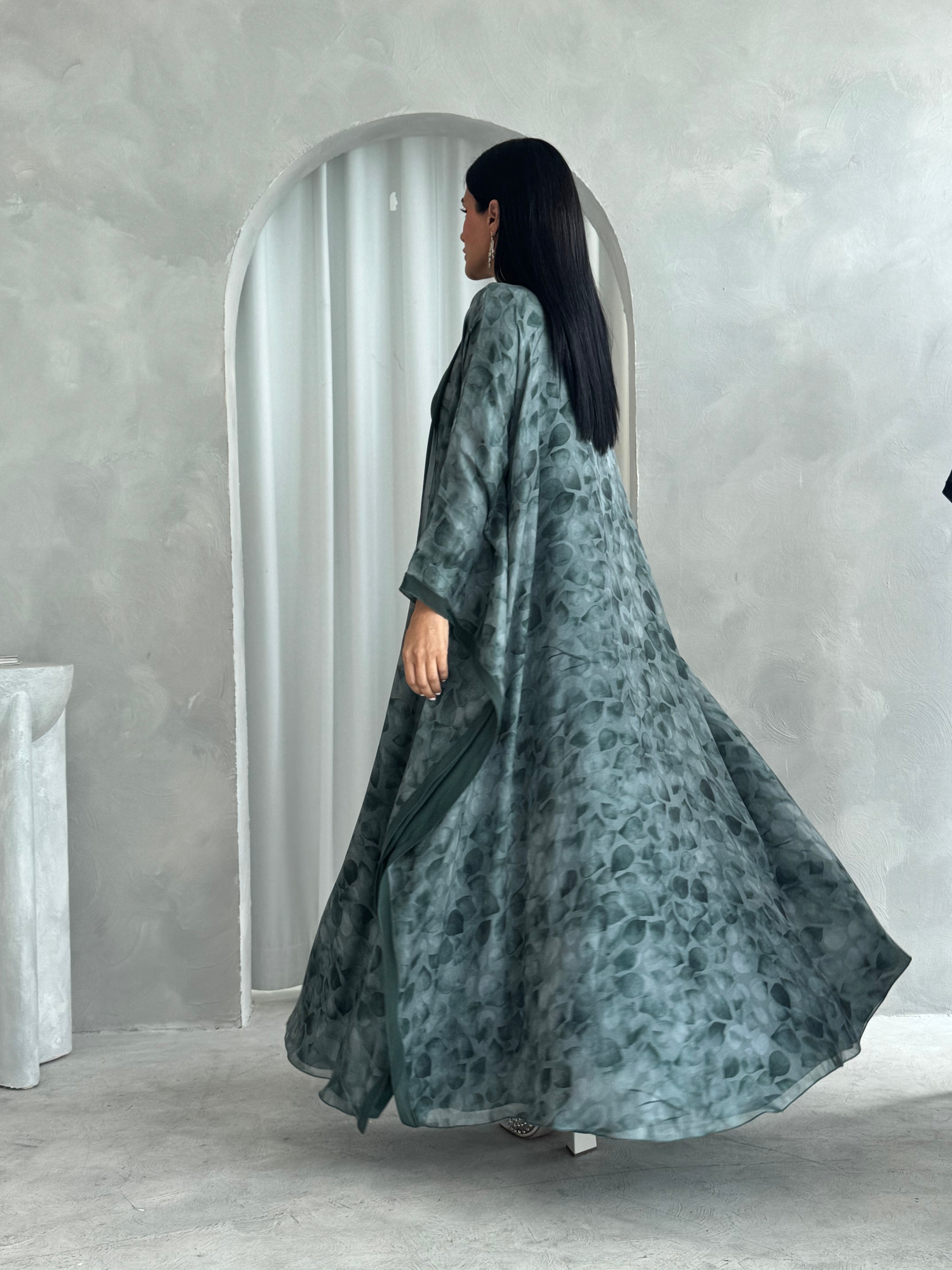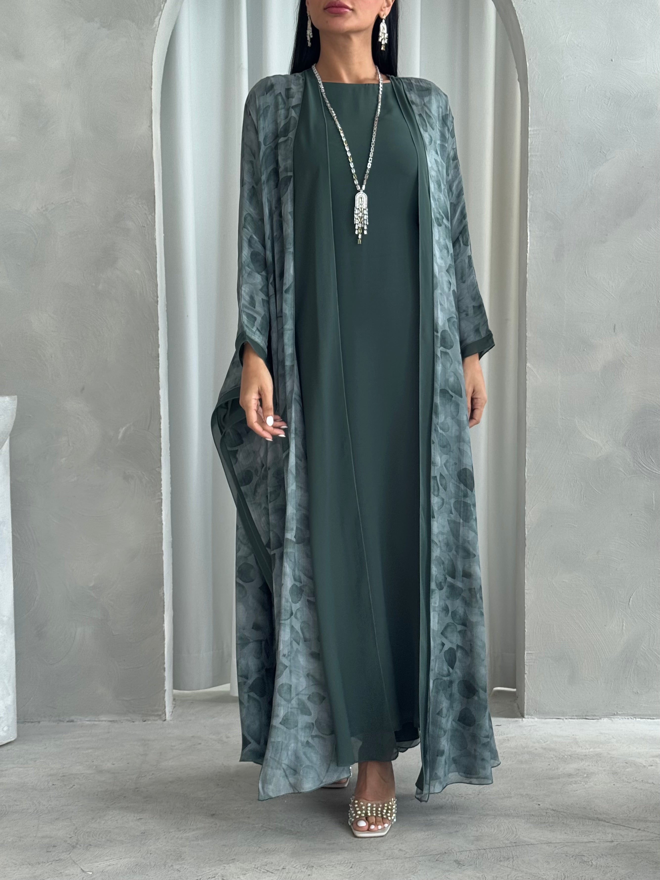 This abaya set includes an abaya, dress, and shaila. Fabric of abaya is organza and chiffon.