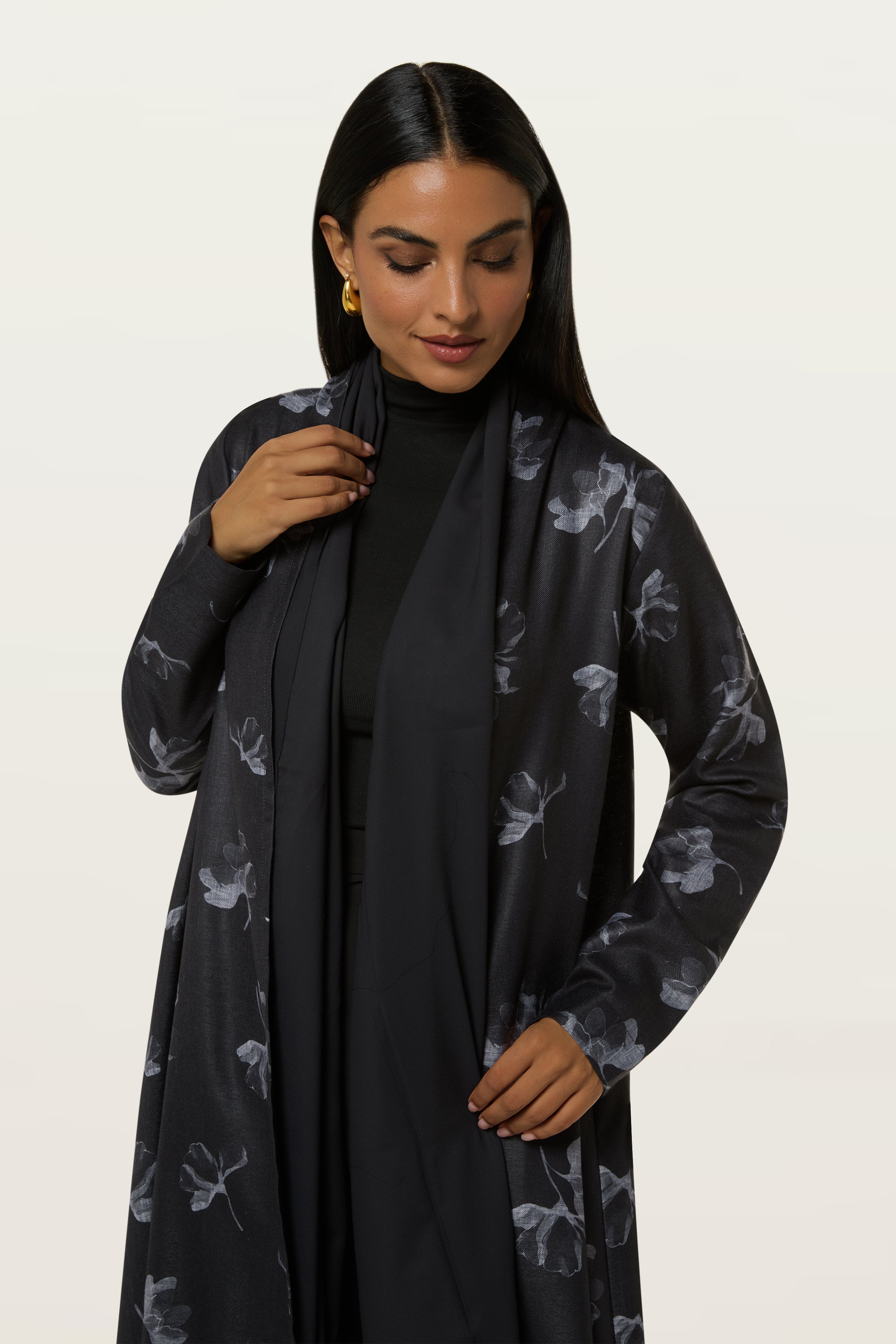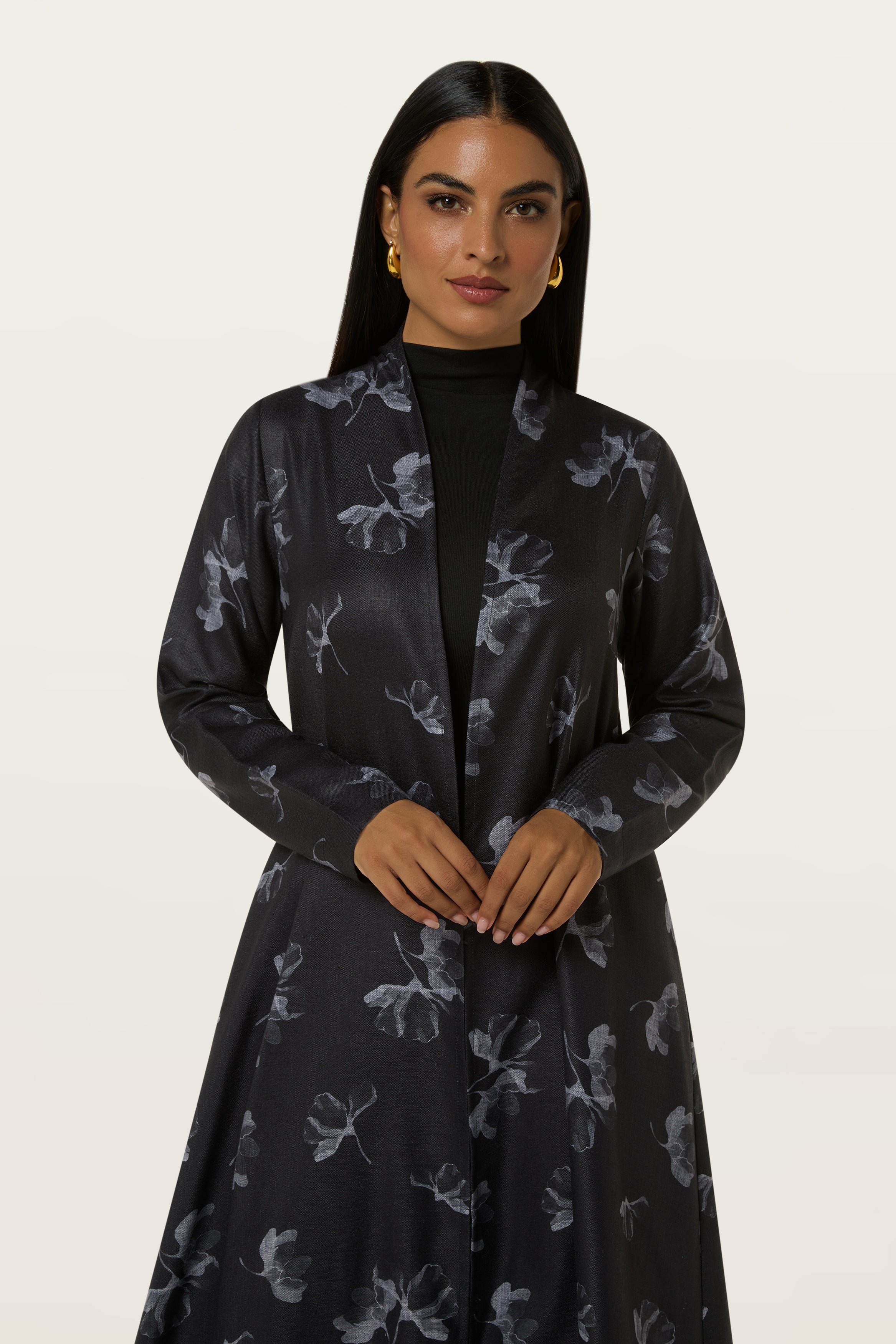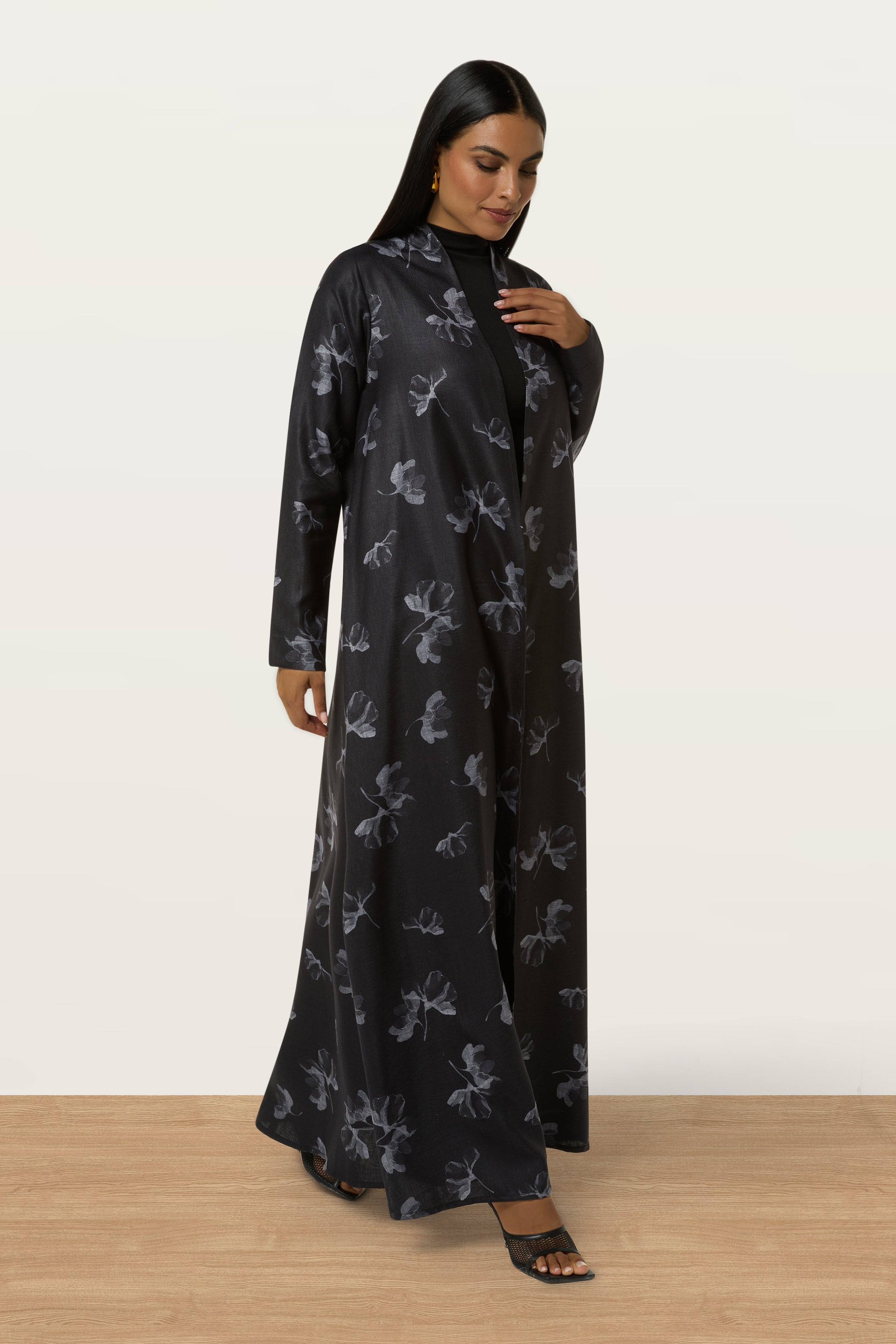 Lightweight printed linen fabric abaya, fully lined with chiffon for added comfort. Due to the natural linen, slight piling may occur, adding to its organic texture.