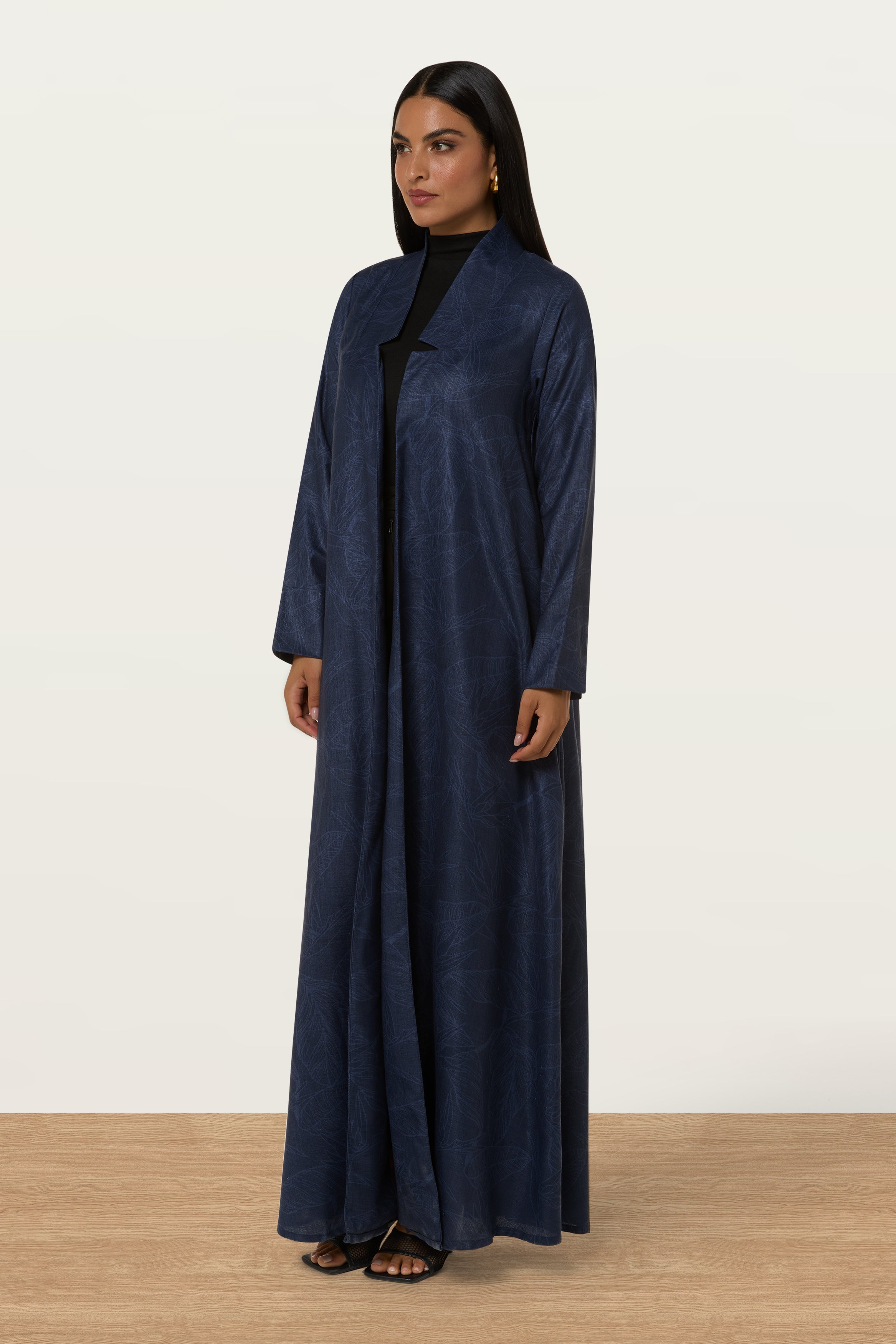 Lightweight printed linen fabric abaya, fully lined with chiffon for added comfort. Due to the natural linen, slight piling may occur, adding to its organic texture.